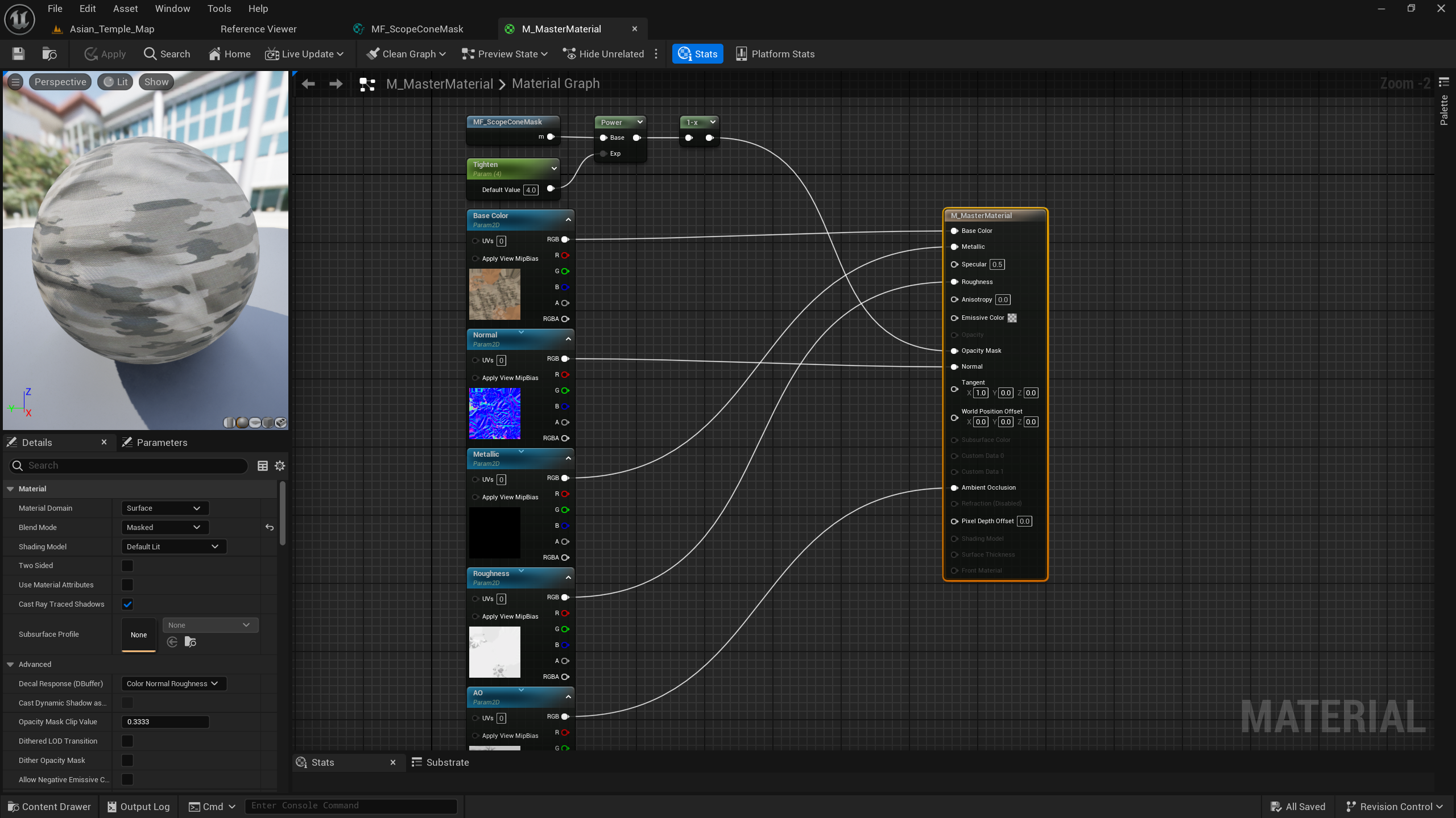 MF_ScopeConeMask 会输出一个 0 到 1 之间的值,用于表示当前像素与瞄准镜光轴之间的关系。数值越接近 1,说明该像素越接近瞄准镜中心;数值越接近 0,则表示该像素已经偏离瞄准镜可视范围。在材质中,这个结果会先经过一个 Power 节点进行处理。这里通过 Tighten 参数控制指数值,从而调节裁剪区域的边缘形状。较大的指数会使可视区域更加集中,边界也会更加清晰,而较小的值则会产生更柔和的过渡效果。