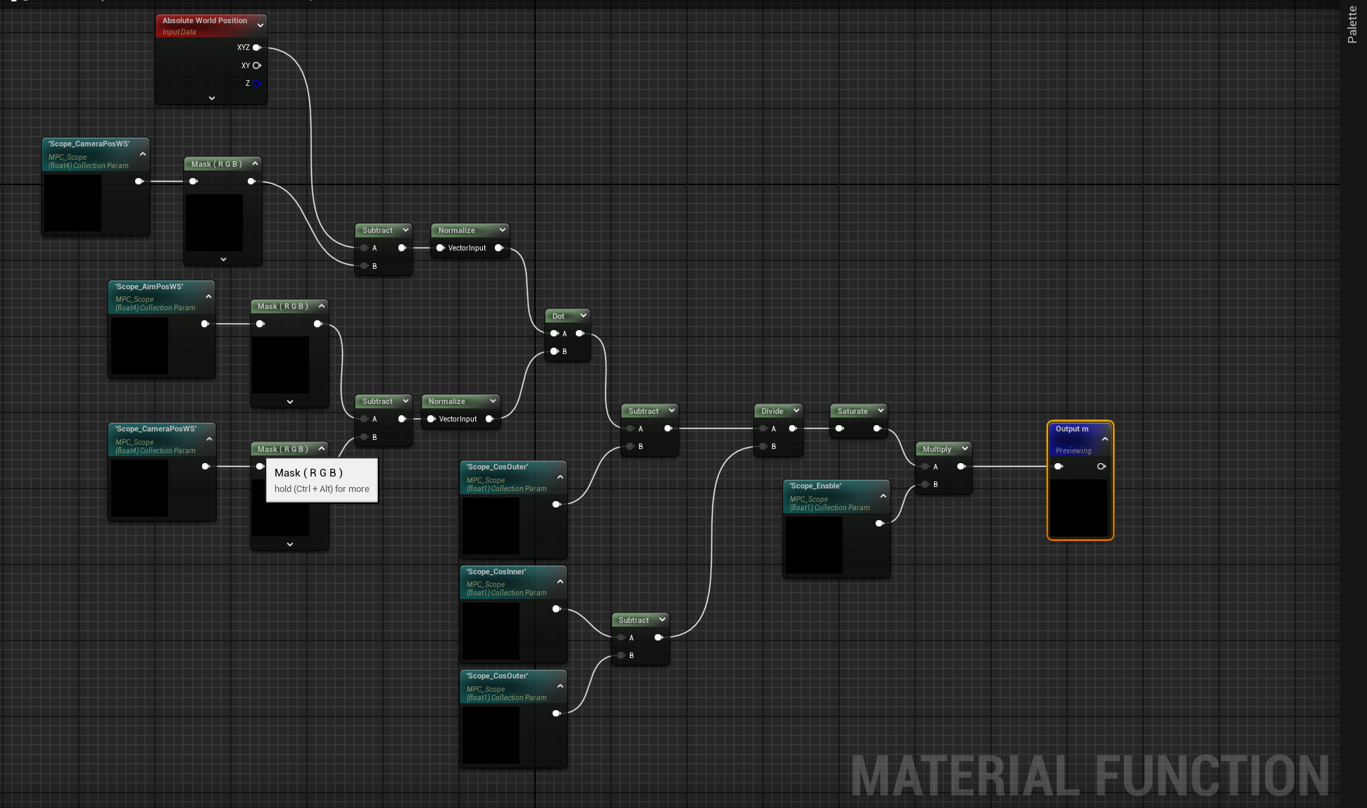 函数的基本输入包括:相机位置、瞄准镜中心位置以及裁剪阈值参数。同时,材质还可以通过 Absolute World Position 节点获得当前像素在世界空间中的位置。利用这些信息,我们可以构造两条关键的方向向量:第一条是从相机指向当前像素的方向,第二条是从相机指向瞄准镜中心的方向。两者分别通过向量减法得到,然后进行归一化处理。