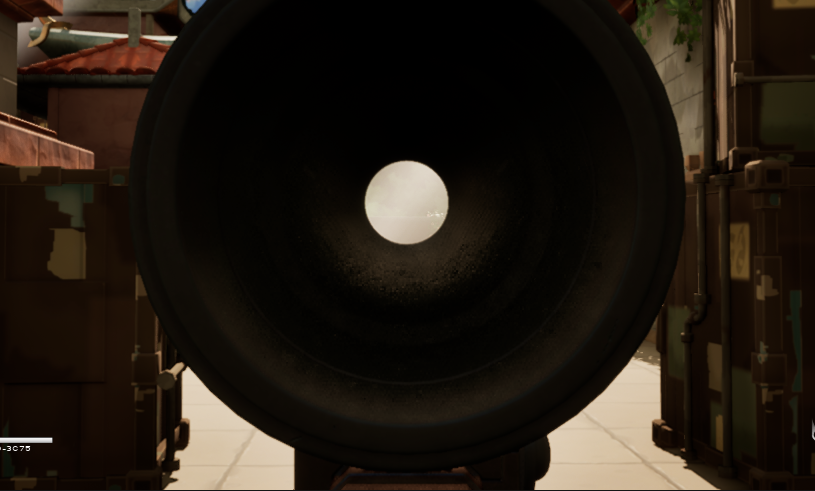 通常是在玩家进入瞄准状态时,在屏幕上叠加一个带有圆形透明区域的 UI 图像,从视觉上模拟瞄准镜的形状,并在中心显示一个准星。由于 UI 只是一种二维遮罩,它并不会真正改变三维场景中的可见性关系,因此很多问题实际上被“掩盖”而不是被解决。例如,UI 无法正确处理镜筒内部的空间结构,也无法自然地处理枪管、武器模型或其他场景物体在镜内外的遮挡关系。此外,在第三人称视角中,摄像机位置与武器发射点通常存在一定的偏移,仅依赖屏幕中心的 UI 准星很难严格保证视觉瞄准点与实际弹道之间的一致性,这在一些情况下会影响射击体验。